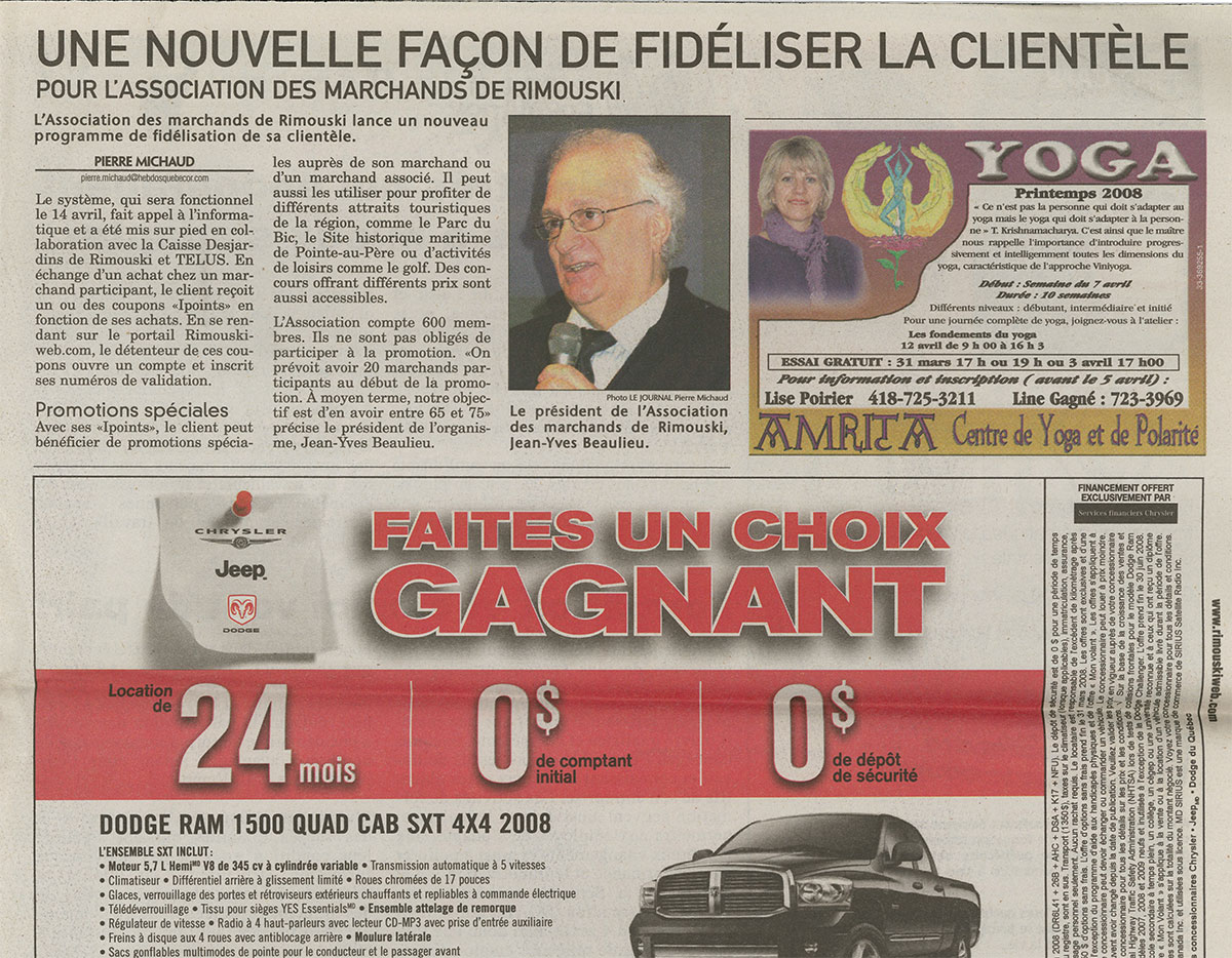 2008 – J’ai lancé un programme de fidélisation en collaboration avec l’Association des marchands de Rimouski, les Caisses Desjardins et TELUS. Ce programme a été extrêmement bénéfique, comptant plus de 600 membres et 96 marchands participants. Il a servi de tremplin économique, apportant un soutien durable à l’économie locale pendant de nombreuses années.